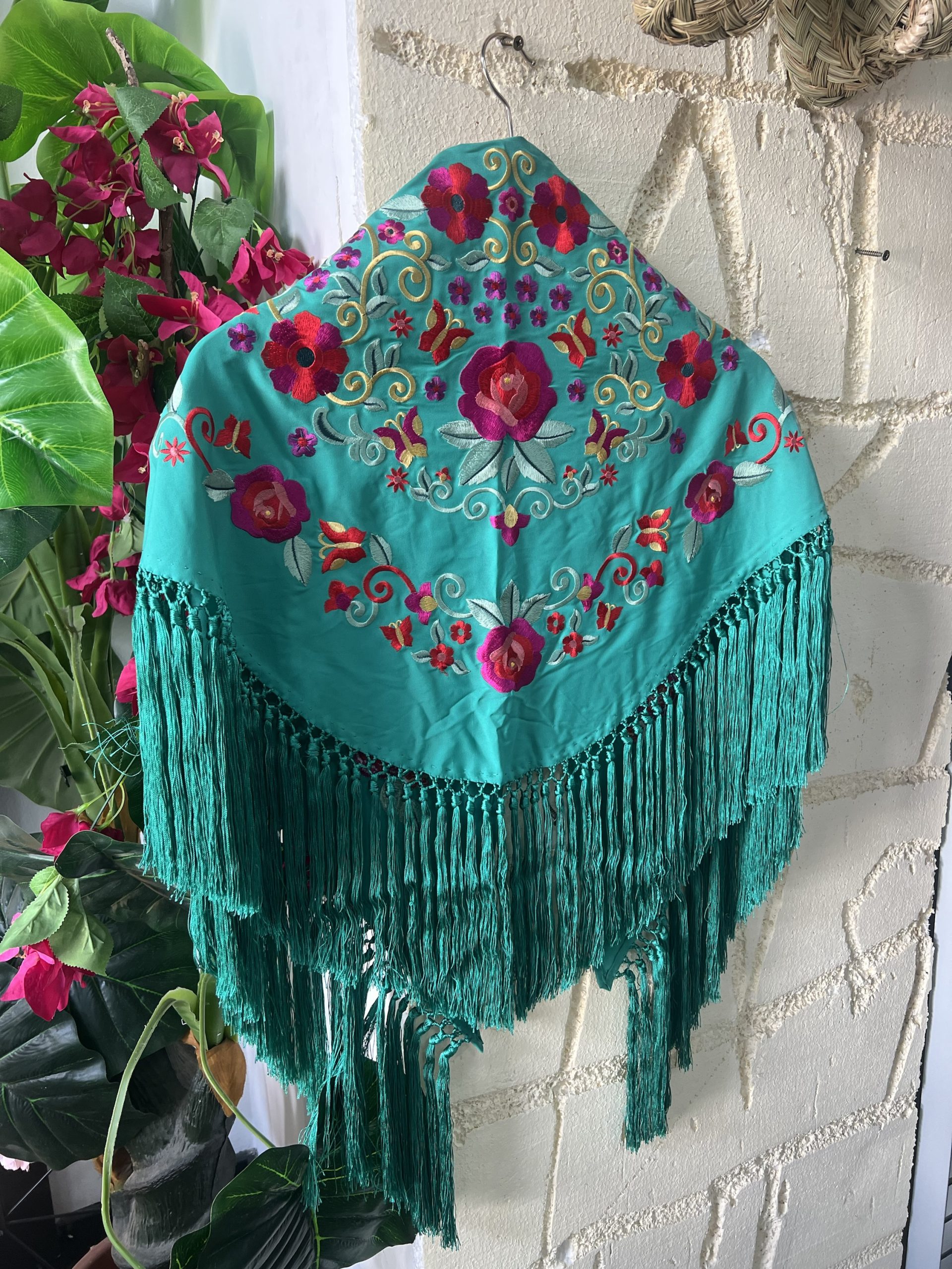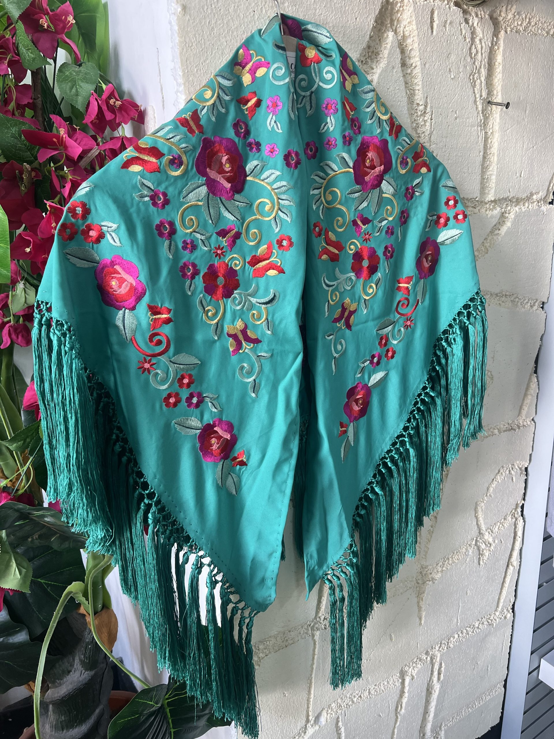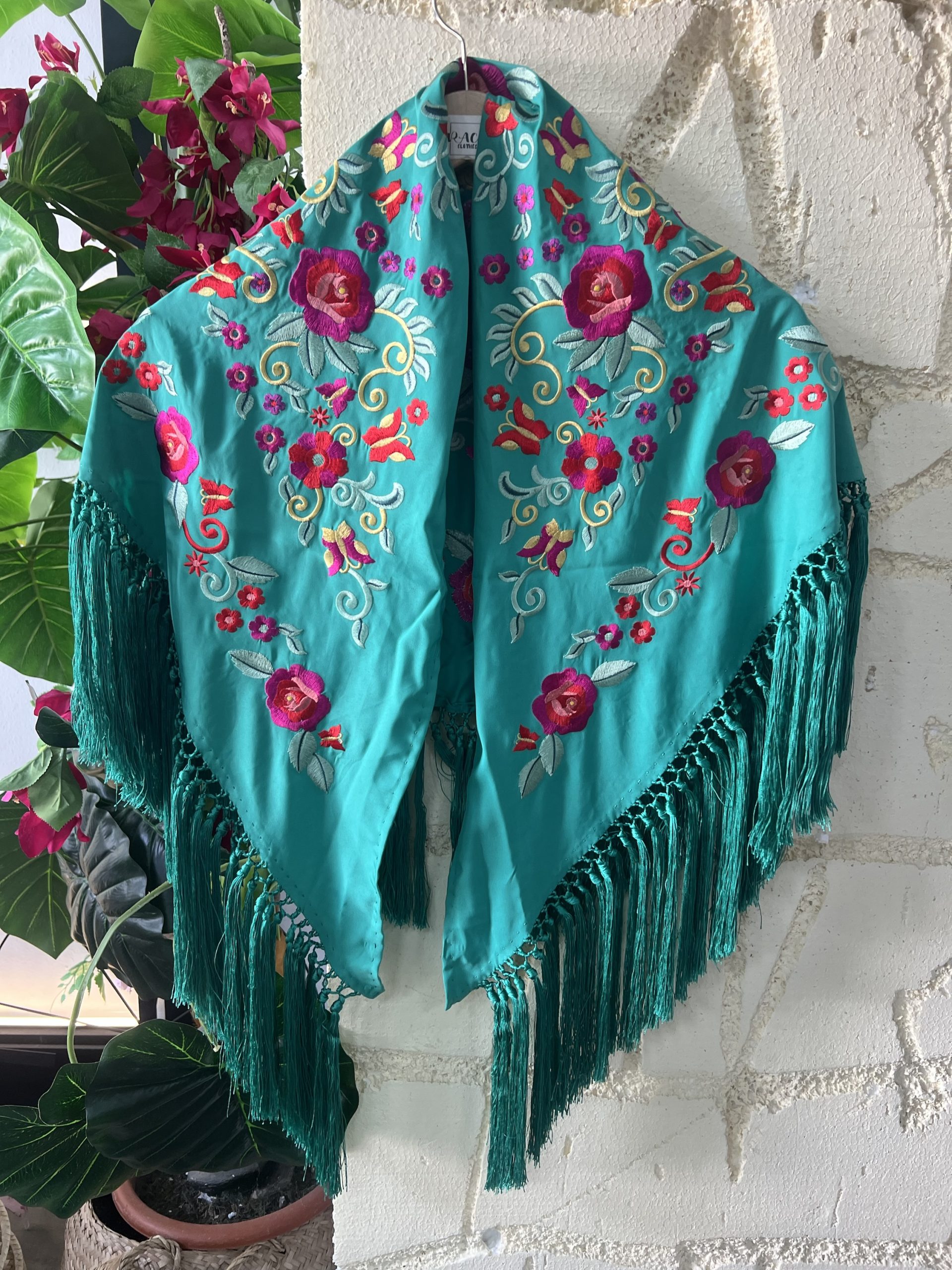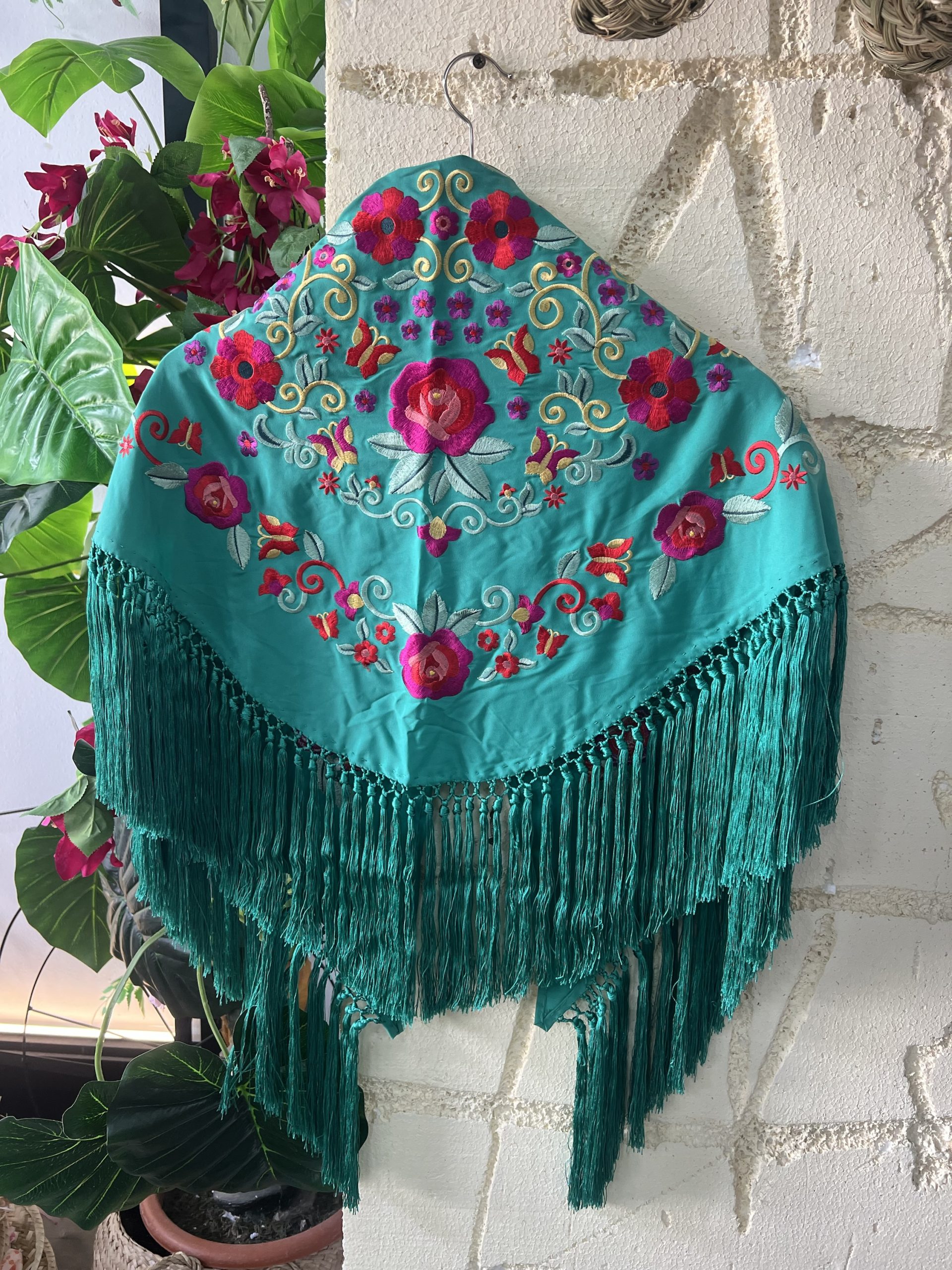 Mantoncillo de seda bordado en color, color mantoncillo verde pavo real