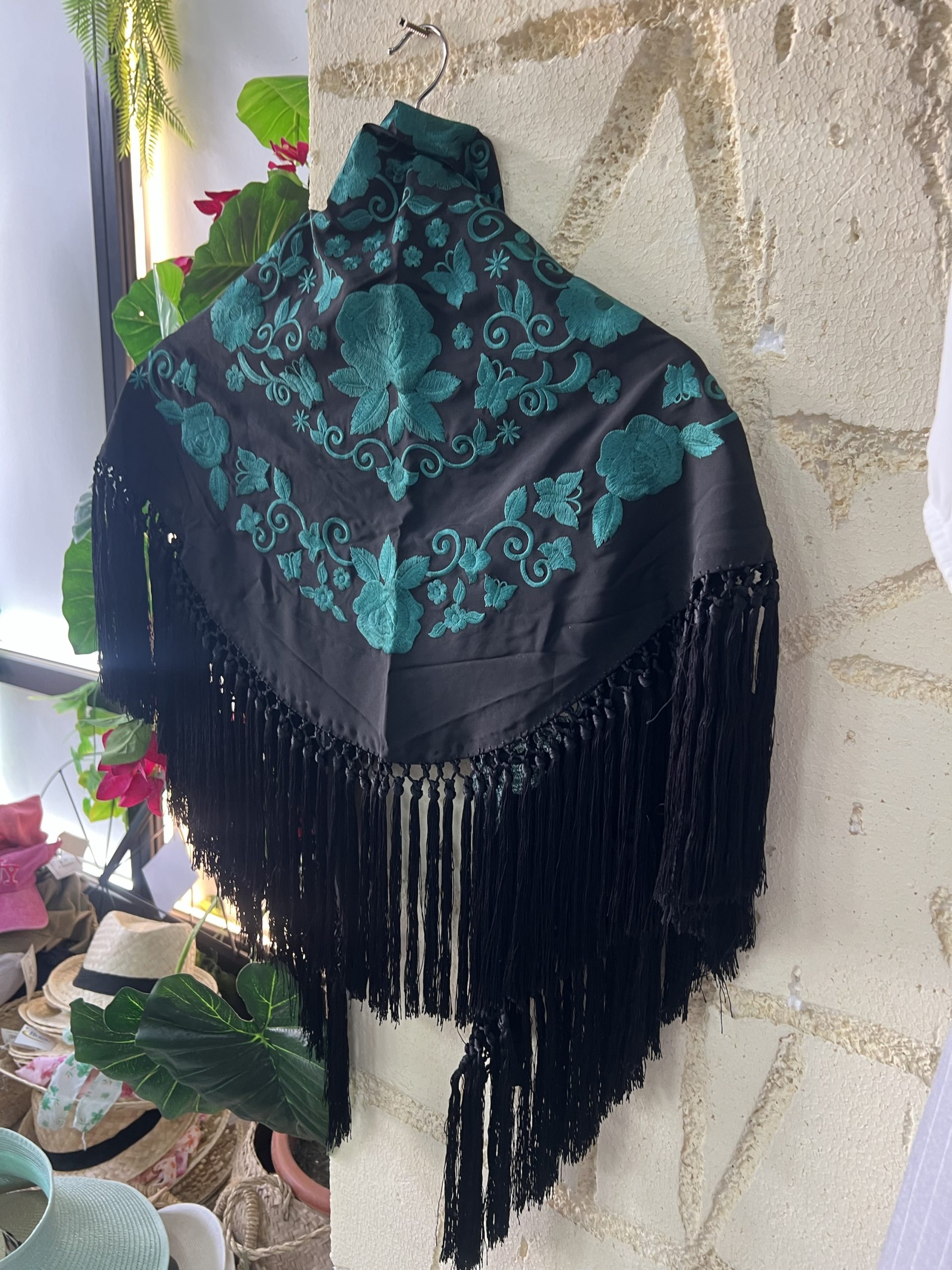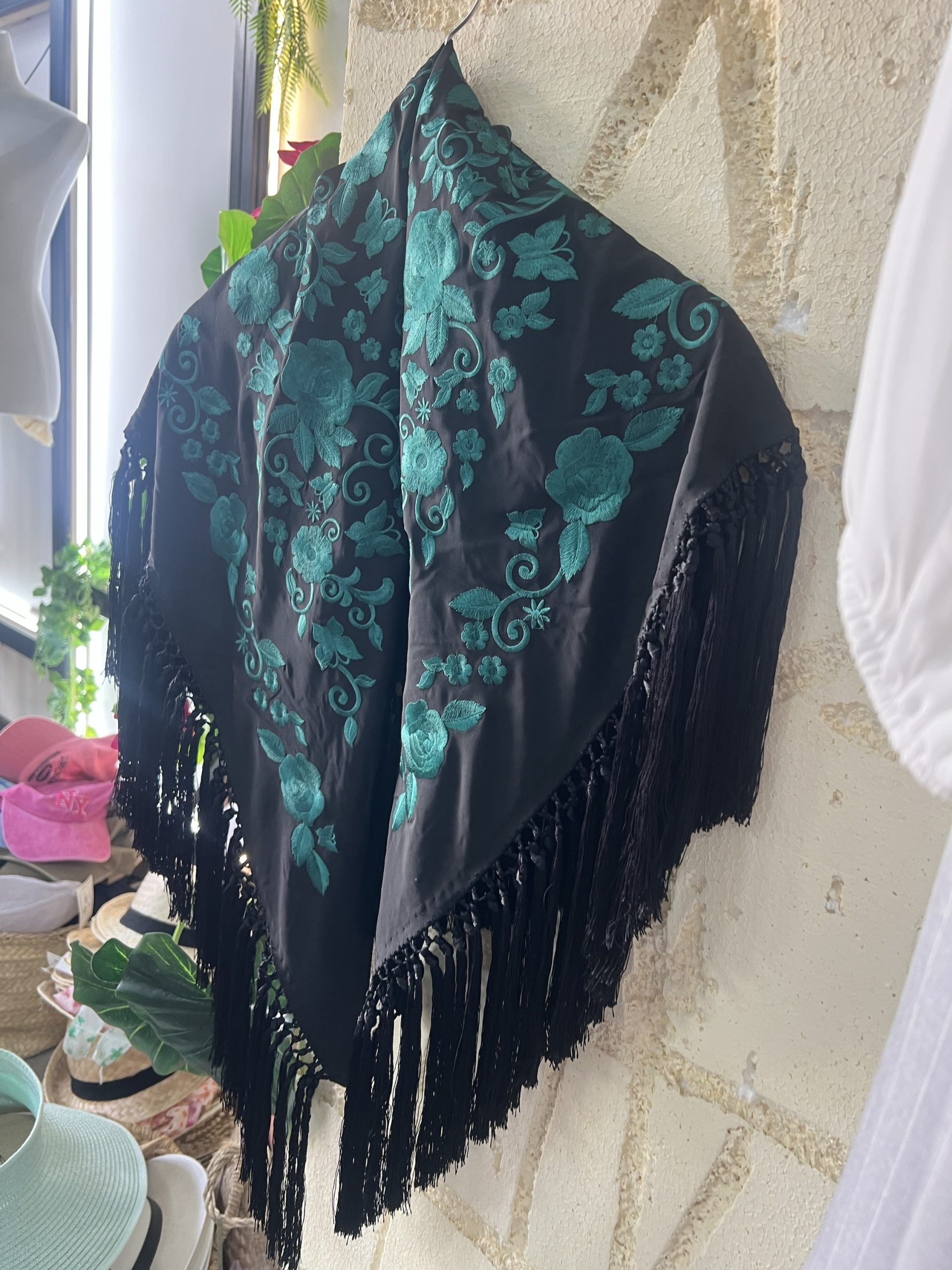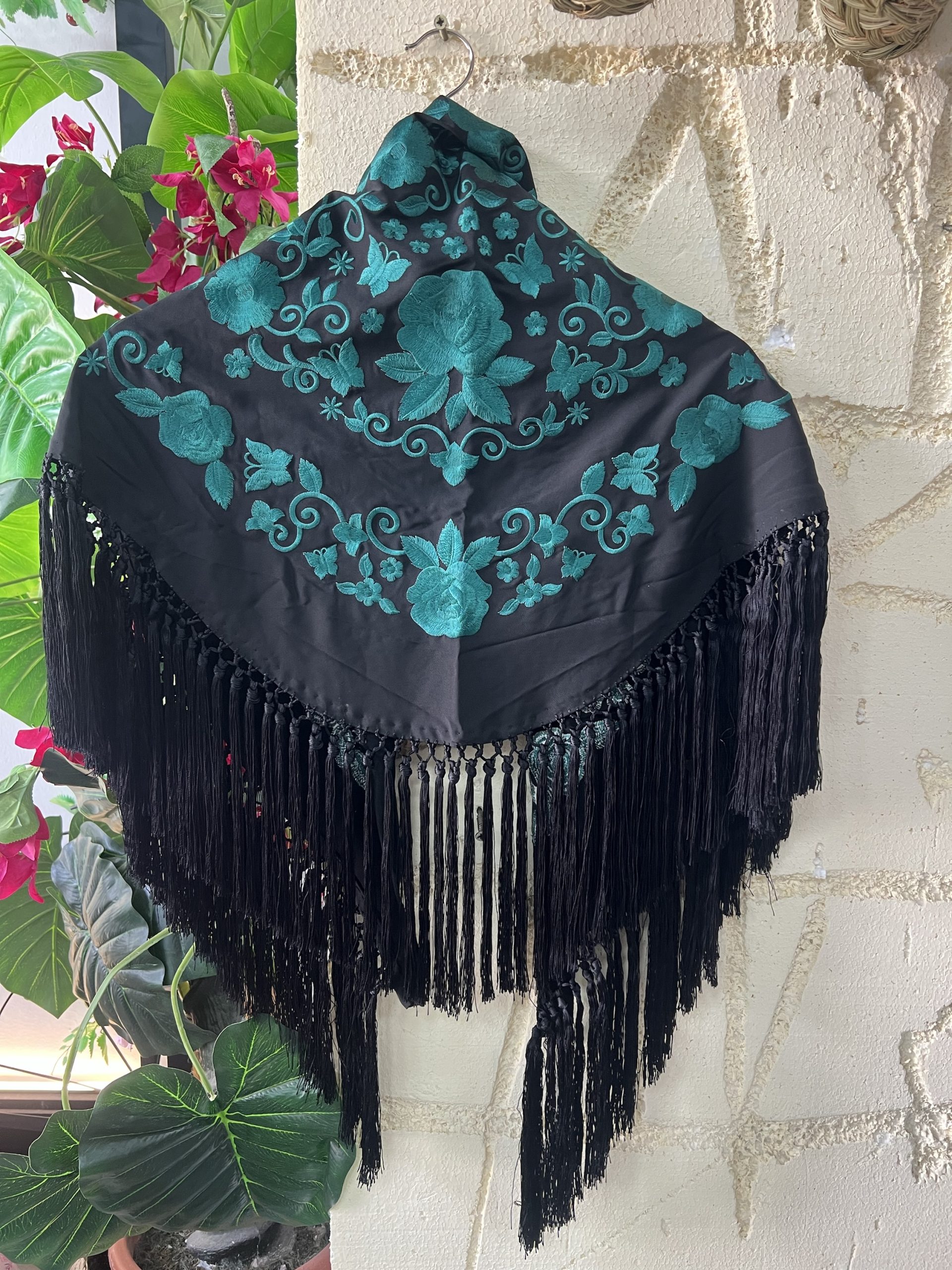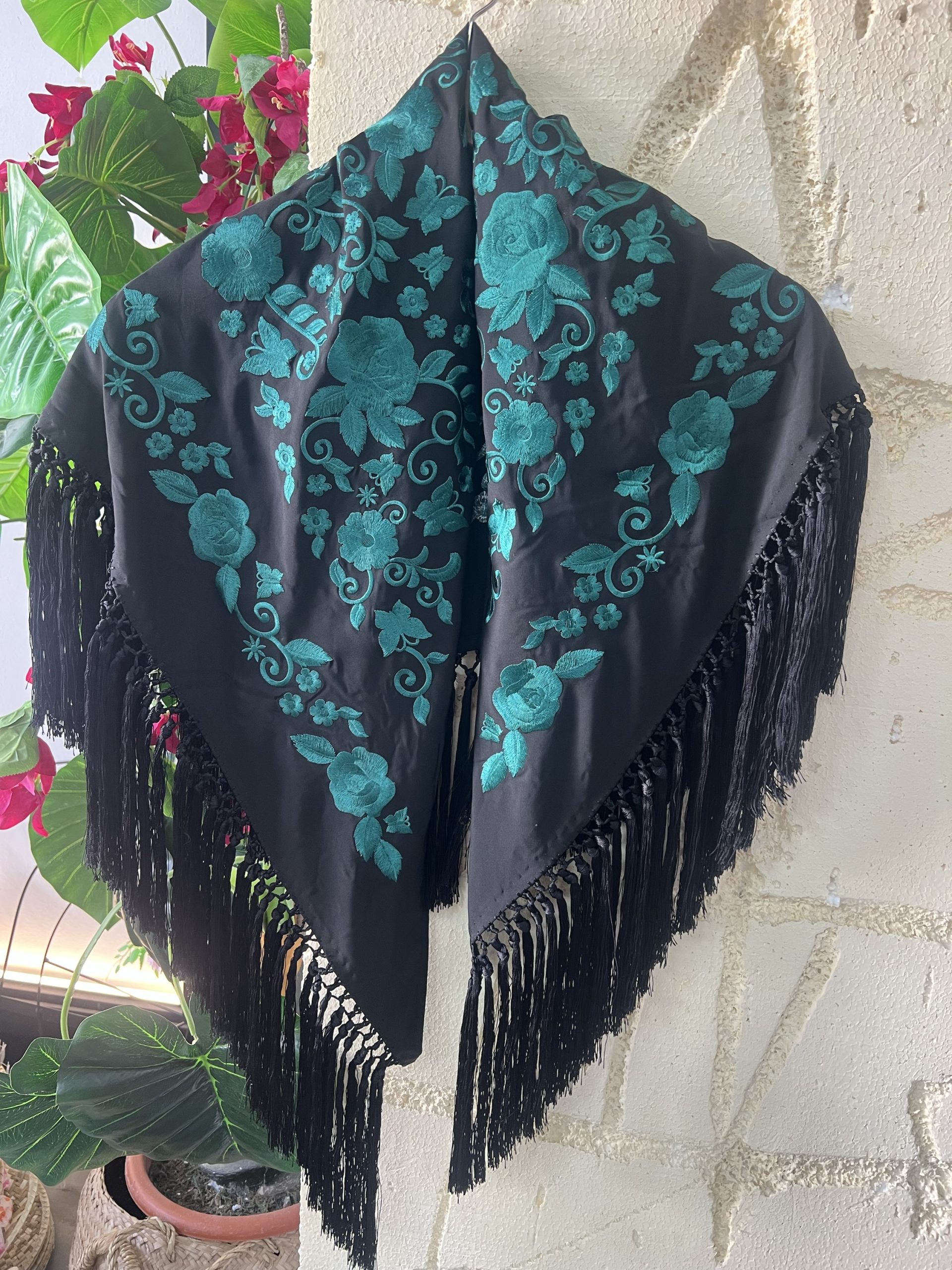 Mantoncillo de seda de color negro y detalles bordado en azul pavo real , fleco corto